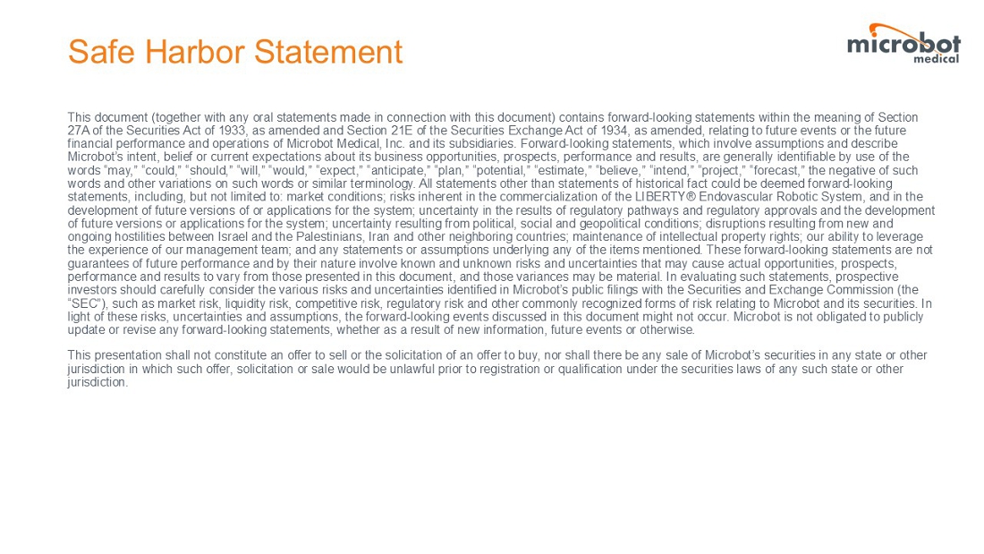 Statements to future financial and/or operating results, future adoption of products, future growth in research, technology, clinical development, commercialization and potential opportunities for Microbot Medical Inc. and its subsidiaries, along with other statements about the future expectations, beliefs, goals, plans, or prospects expressed by management, constitute forward-looking statements within the meaning of the Private Securities Litigation Reform Act of 1995 and the Federal securities laws. Any statements that are not historical fact (including, but not limited to statements that contain words such as “contemplates,” “continues,” “could,” “forecasts,” “intends,” “may,” “might,” “possible,” “potential,” “predicts,” “projects,” “should,” “would,” “will,” “believes,” “plans,” “anticipates,” “expects,” “estimates” and similar expressions) should also be considered to be forward-looking statements, but the absence of these words does not mean that a statement is not forward-looking. Forward-looking statements involve risks and uncertainties, including, without limitation, market conditions, risks inherent in the commercialization of the LIBERTY® Endovascular Robotic System, and in the development of future versions of or applications for the system, uncertainty in the results of regulatory pathways and regulatory approvals, uncertainty resulting from political, social and geopolitical conditions, particularly any changes in personnel or processes or procedures at the FDA and announcements of tariffs on imports into the U.S., disruptions resulting from new and ongoing hostilities between Israel and the Palestinians, Iran and other neighboring countries, and maintenance of intellectual property rights. Additional information on risks facing Microbot Medical® can be found under the heading “Risk Factors” in Microbot Medical’s periodic reports filed with the Securities and Exchange Commission (SEC), which are available on the SEC’s web site at www.sec.gov. Microbot Medical® disclaims any intent or obligation to update these forward-looking statements, except as required by law.