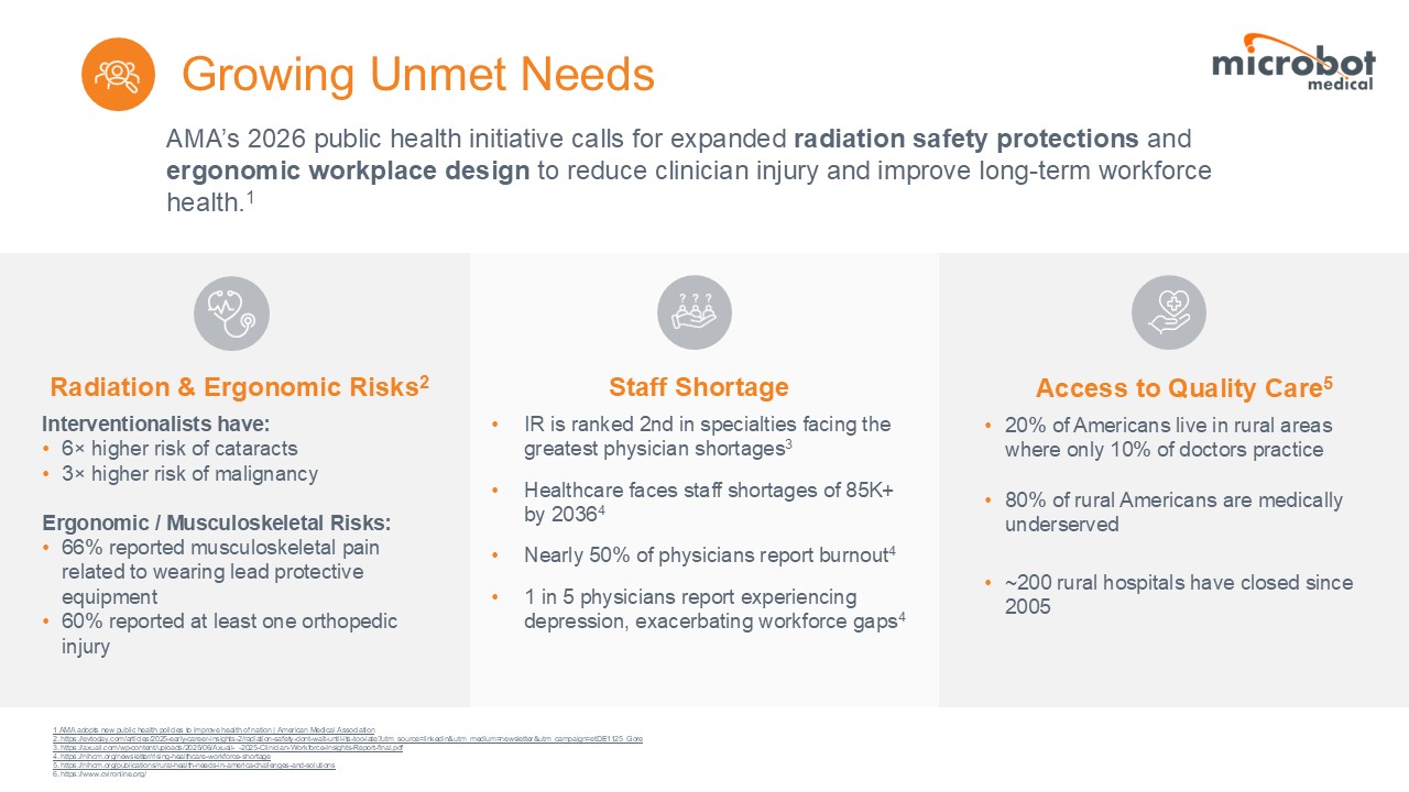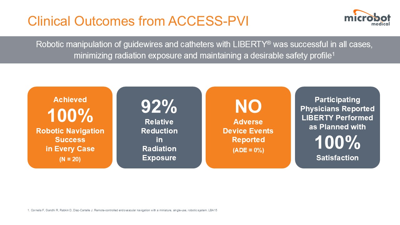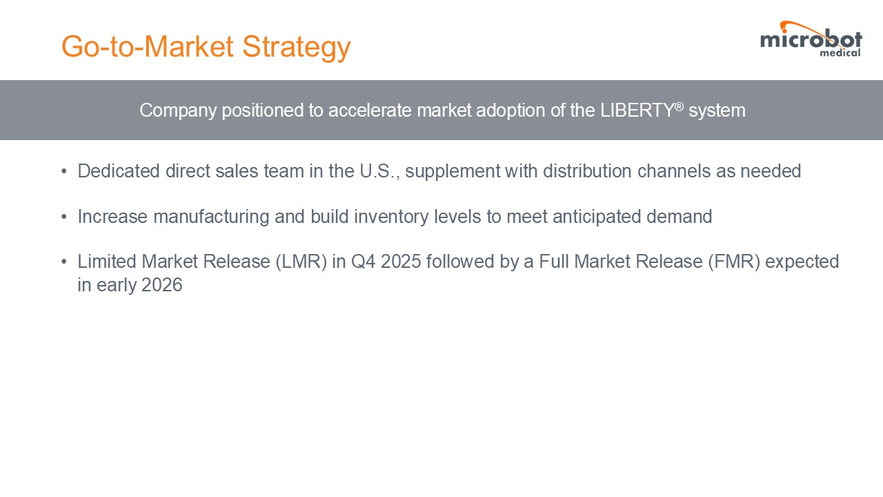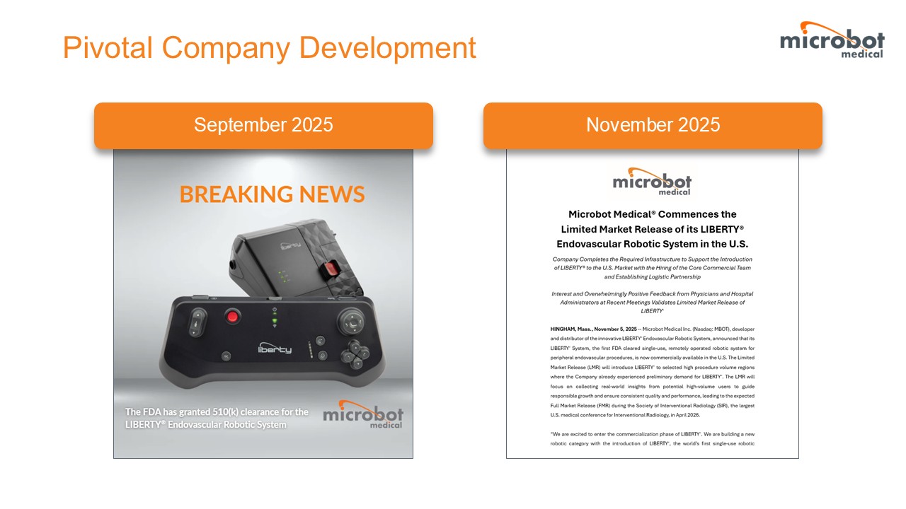 LIBERTY is the only FDA cleared, single-use, remotely operated robotic system for peripheral endovascular procedures, and it is designed for precise vascular navigation while aiming to reduce radiation exposure and physical strain. The Company commenced the limited market release of the LIBERTY system in late 2025 and plans for a full market release at the Society of Interventional Radiology (SIR) conference in April 2026, allowing the Company to showcase LIBERTY with the goal to deepen market adoption.