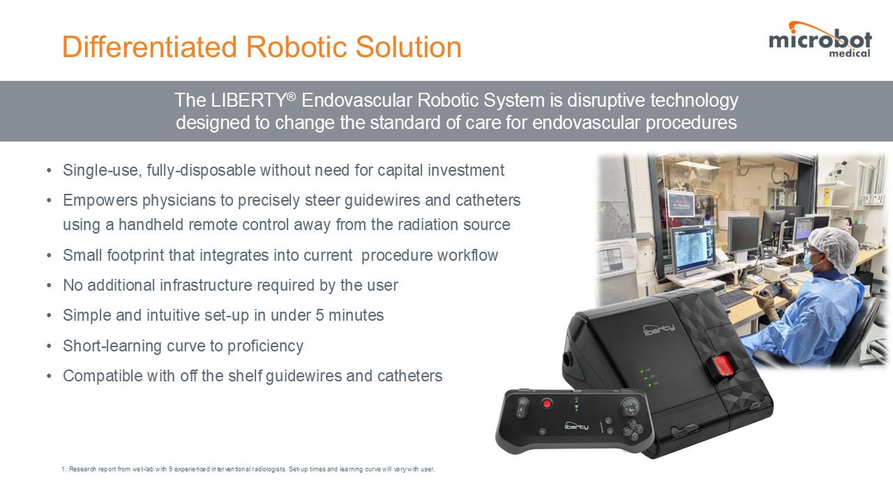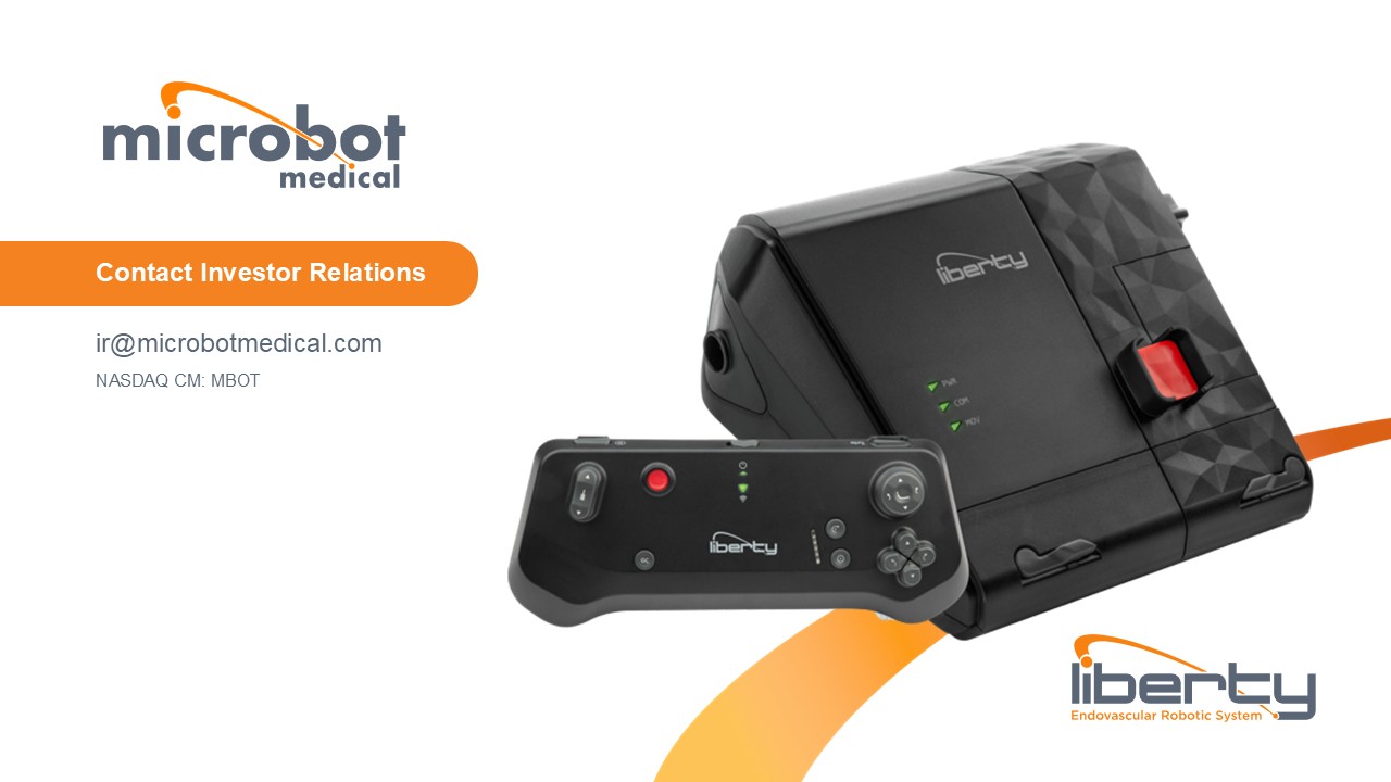Microbot Medical Inc. (NASDAQ: MBOT) is a commercial stage medical device company focused on transforming endovascular procedures through advanced robotic technology. Microbot’s LIBERTY® Endovascular Robotic System is the world’s first FDA cleared single-use, remotely operated robotic solution designed for precision, efficiency and safety. Backed by a strong intellectual property portfolio and a commitment to innovation, Microbot is driving the future of endovascular care.